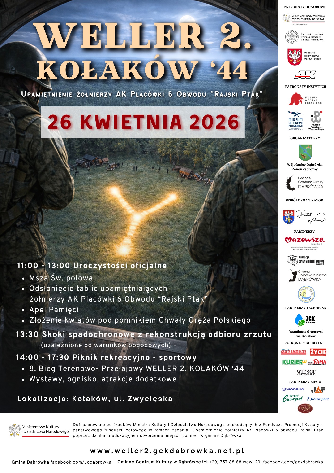Akcja zrzutu skoczków i sprzętu na placówkę odbioru „Imbryk” w ramach operacji lotniczej „Weller 2” odbyła się w nocy z 9 na 10 kwietnia. Odbiorem zrzutu kierował porucznik Jan Górski „Jastrzębiec”. Obecny był także komendant placówki AK Małopole porucznik Leon Wiśniewski „Wicz” nauczyciel w Karolewie i jego zastępca podporucznik Tadeusz Andruszkiewicz „Zator” – nauczyciel w szkole w Chajętach. W akcji uczestniczyło, co najmniej kilkunastu żołnierzy Armii Krajowej z terenu dzisiejszej gminy Dąbrówka. Załoga samolotu z samodzielnej polskiej eskadry 1586, była dowodzona przez kapitana Kazimierza Wunsche. Skoczkowie, którzy zostali zrzuceni na polanę w Kołakowie to podporucznik Stefan Bałuk „Starba”, porucznik Edmund Łastowski „Łobuz”, kapitan Tadeusz Runge „Osa” i kurier Henryk Waniek „Pływak”.